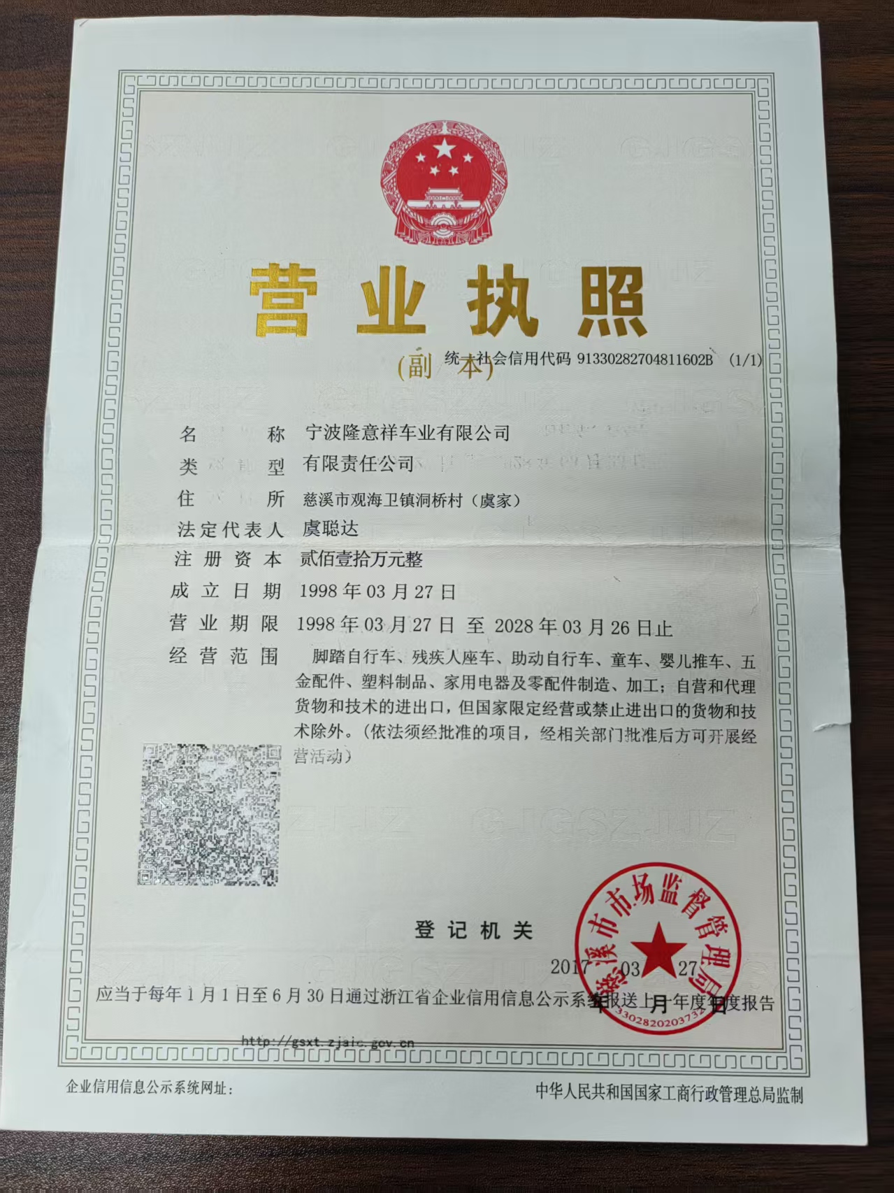 اسم الشهادة: 宁波隆意祥车业有限公司